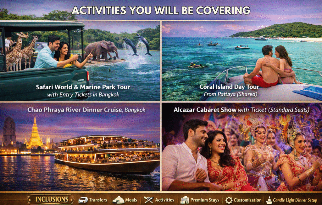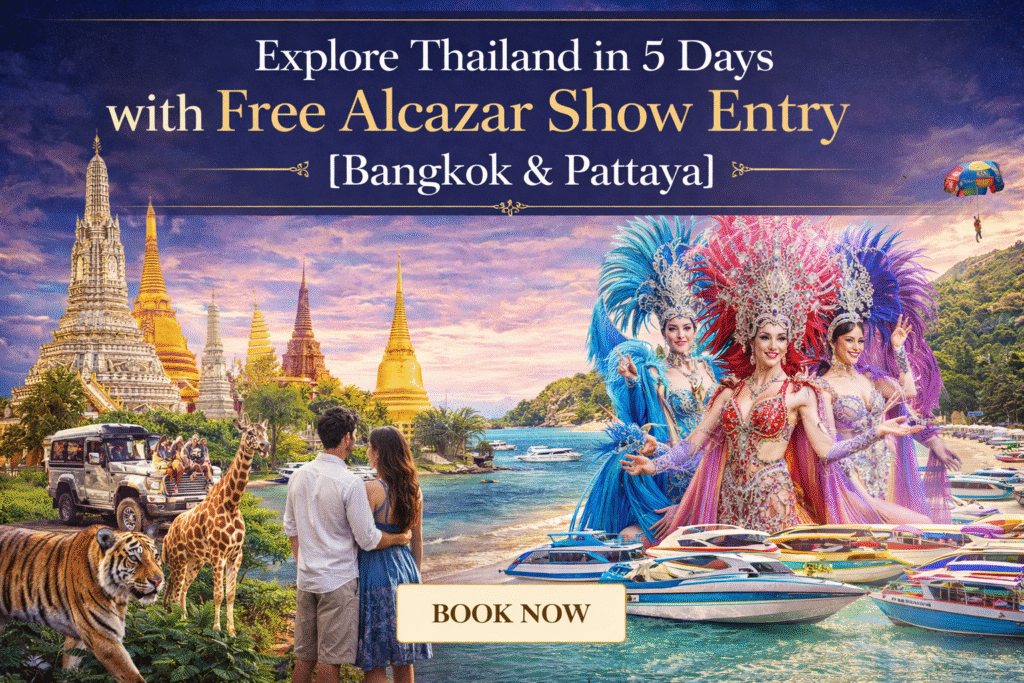 This Thailand tour is perfect for travellers who want the best of everything in one trip—city life, beaches, wildlife, culture, and entertainment. It combines the energy of Bangkok’s iconic landmarks, the relaxed coastal charm of Pattaya, thrilling safari and marine experiences, and unforgettable evening entertainment like the FREE Alcazar Cabaret Show. The itinerary is well-balanced, making it ideal for couples, families, and first-time visitors who want a stress-free, exciting, and value-packed holiday without rushing between destinations.