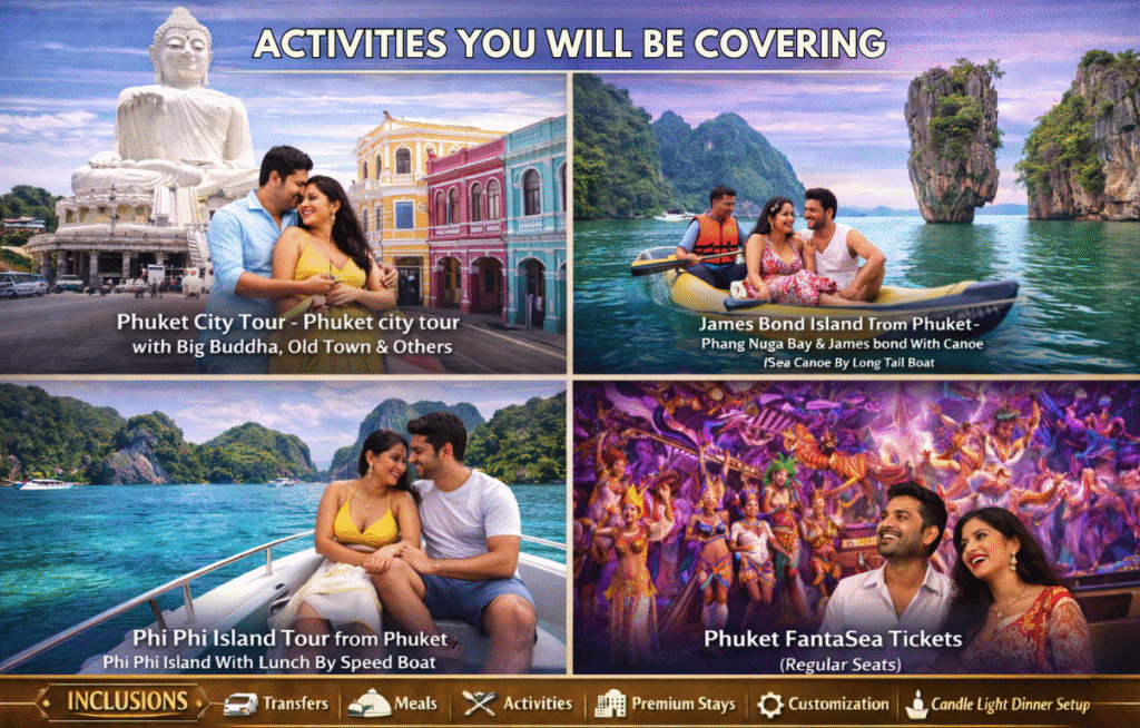 This romantic honeymoon package is thoughtfully designed to give couples the best of Phuket. It includes a guided Phuket City Tour covering the iconic Big Buddha and charming Old Town, an adventurous Phi Phi Island tour with lunch by speedboat, and a scenic James Bond Island excursion with sea canoeing. Couples also enjoy an evening at Phuket FantaSea, relaxing time at Patong Beach, vibrant nightlife at Soi Bangla, and a magical visit to Maya Bay, famous for its turquoise waters and dramatic cliffs.