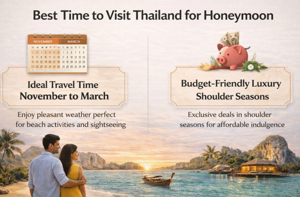 The best time for a honeymoon in Thailand is from November to March, when the weather is pleasant and ideal for beach activities and sightseeing. However, couples looking for budget-friendly luxury can also plan trips during shoulder seasons with exclusive resort offers.