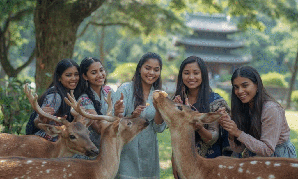 A vast green park known for its friendly, free-roaming deer and beautiful shrines, offering visitors a peaceful escape surrounded by nature and history.