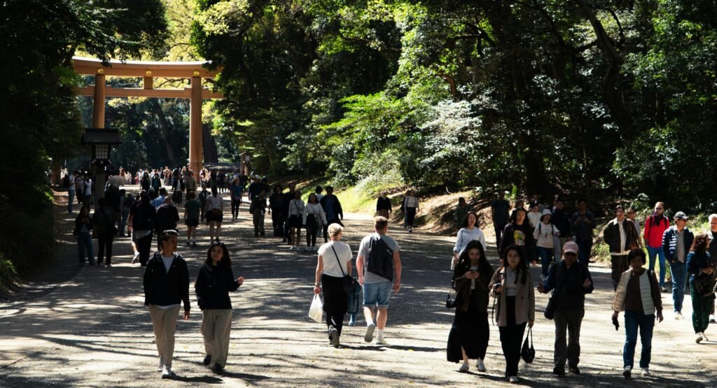 A famous Shinto shrine nestled in a lush forest, renowned for its traditional architecture, peaceful walking paths, and cultural festivals, offering visitors a serene spiritual and cultural experience in Tokyo.